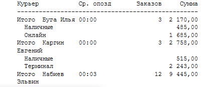 Количество заказов смотрите в отчете «04 ОТЧЕТ ПО КАССЕ», «050 Отчет по доставкам», пролистать вниз Итого Фамилия Имя курьера см. колонку Заказов. В секции ЗАКРЫТЫЕ ЗАКАЗЫ указаны все закрытые заказы данных курьеров.