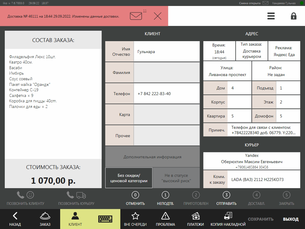 На рисунке выше: Данные о курьере на вкладке "клиент" в одной из доставок.