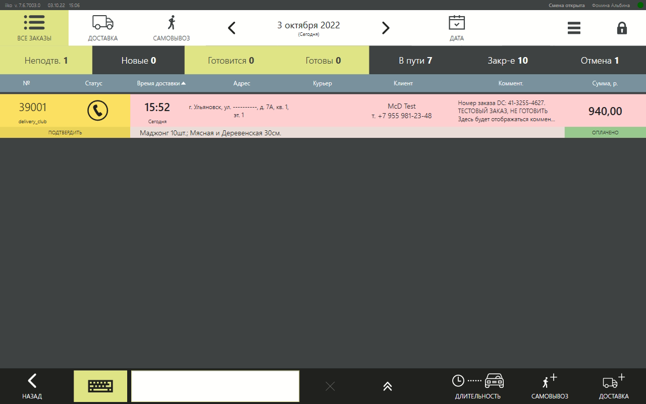 - Откройте доставку в кассовом приложении iikoFront и нажмите "ОТПРАВИТЬ"